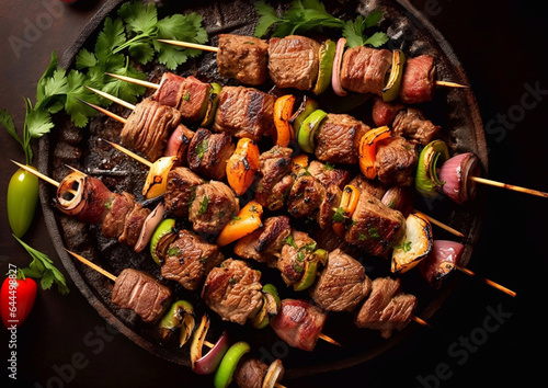 Various meat skewers with vegetables on round grill.Top view.AI Generative