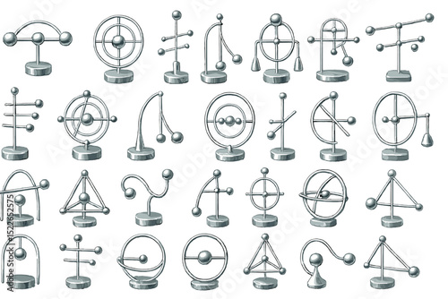Various metal sculptures representing abstract forms and geometric shapes displayed on a neutral background