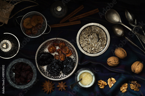 Various nuts and dried fruits in metal dishes on the table. Top view