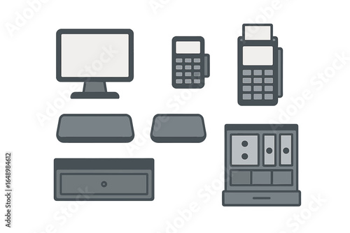 Various office devices and equipment displayed together in a minimalistic style for organizational purposes