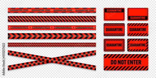 Various quarantine zone warning tapes and shields. Novel coronavirus outbreak. Global lockdown. Coronavirus danger stripe. Police caution line, restricted area. Construction tape. Vector illustration