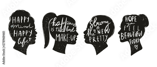 Various quotes on women's head silhouettes. Hand drawn black and white vector set. Trendy illustration. Flat design. All elements are isolated