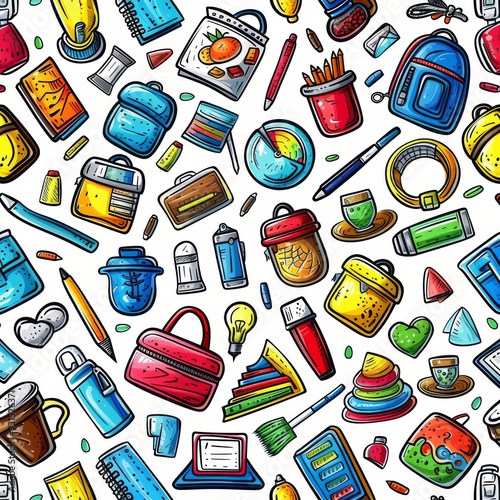 Various school supplies are displayed on a white seamless pattern.