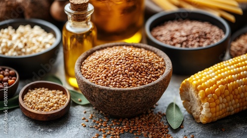 Various seeds, vegetable oil, and corn displayed on table