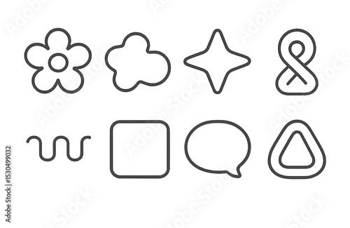 Various simple line art shapes including flowers, stars, and speech bubbles on a white background suitable for design projects