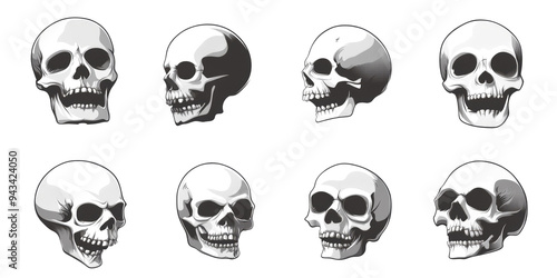 Various skull illustrations showcasing different angles and styles of skeletal anatomy