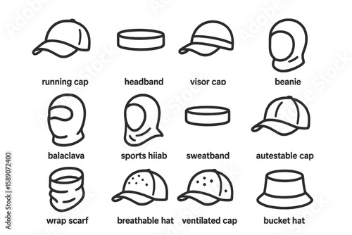 Various styles of headwear: caps, beanies, scarves, and more illustrated