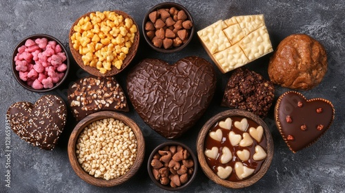 Various Sweet and Sugary Desserts Arranged Artistically on Dark Gray Background
