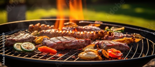 Various tasty grilled meat and veggies on BBQ with smoke and flames on green lawn