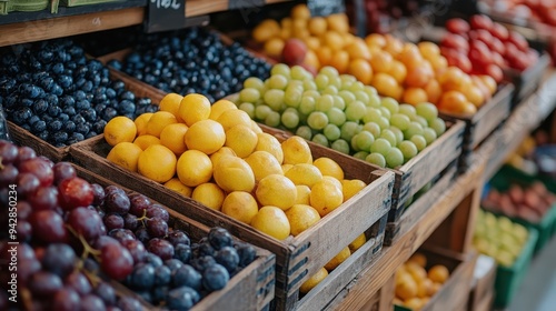 Various type of fresh fruits arrange neatly grocery store,avocado,strawbwrry,Apple,Orange,Lemon on rack,Fresh healthy fruits on shelves in supermarket,sunday market,organic farm.