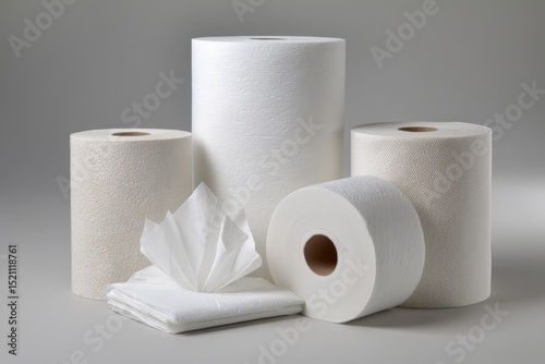 Various types of absorbent paper rolls and sheets displayed on a neutral background