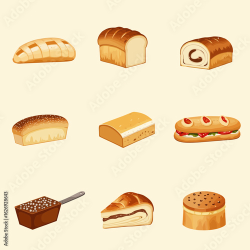 Various types of bread and baked goods in a flat design style