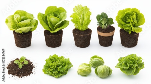 Various types of fresh green leafy vegetables are displayed in soil pots on a bright white background.