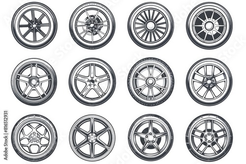 Various types of wheels on a plain white background. Ideal for automotive industry concepts