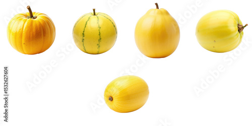 Various types of yellow melons arranged linearly on a transparent background with transparent elements highlighting individual fruits and their distinct shapes and sizes.