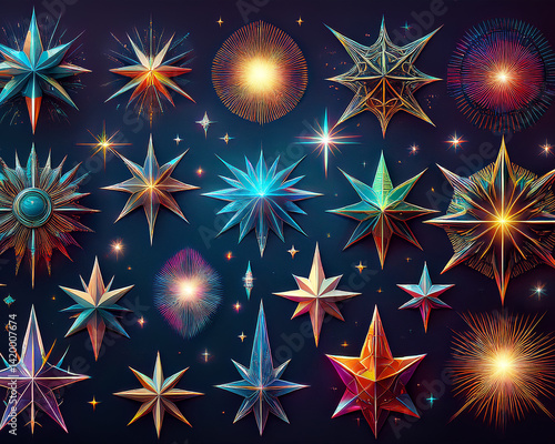 Various warped stars, rave burst, spikes, cyber tribal elements, y2k blings, and abstract sharp lines. Combine aspects of a retro futuristic tribal universe.