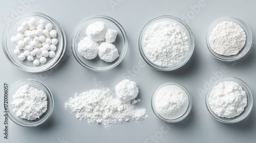 Various white powders and solid substances in clear bowls and spilled on a light grey surface.