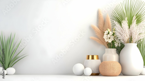 Vases with foliage & spheres on shelf. White wall backdrop in staged interior