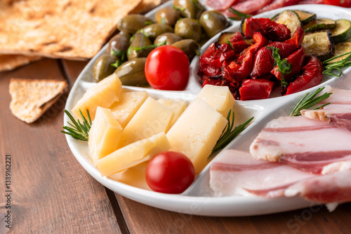 Vassoio con formaggio, pancetta, peperoni, zucchine e olive, stuzzichini italiani