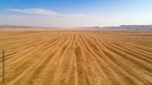 Vast, arid desert landscape with tire tracks crisscrossing the sandy terrain, leading towards distant hills