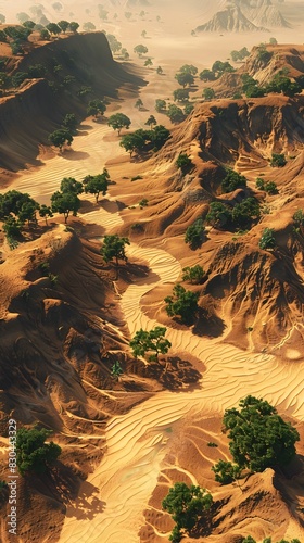Vast Arid Landscape with Eroding Dunes and Scarce Vegetation Due to Desertification