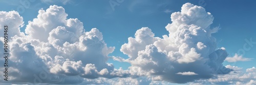 Vast, cloudless azure sky, fluffy white cumulus clouds drifting , horizon, cotton, weather