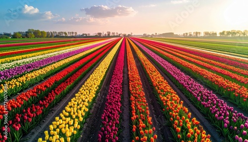 Vast Colorful Tulip Field Under Golden Hour Sunlight with Rows of Red Yellow Purple Pink Orange and White Blooms Stretching to the Horizon Under a Blue Sky with Wispy Clouds