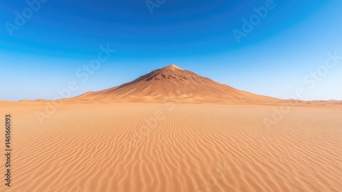 Vast desert landscape with a solitary mountain. Sunrise or sunset light illuminates the flat, sandy terrain
