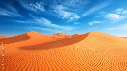 "Vast Desert Landscape with Rolling Sand Dunes, Golden Hues, and a Tranquil Horizon Under a Clear, Expansive Sky"