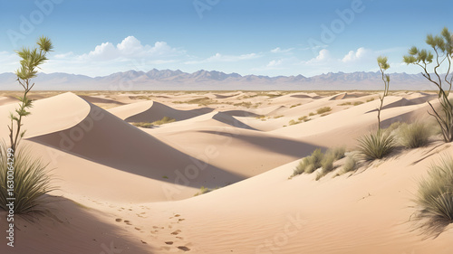 Vast desert landscape with sand dunes, spiky vegetation, and distant mountains under blue sky