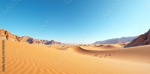 Vast empty desert landscape with clear blue sky for copy space, horizon, scenic