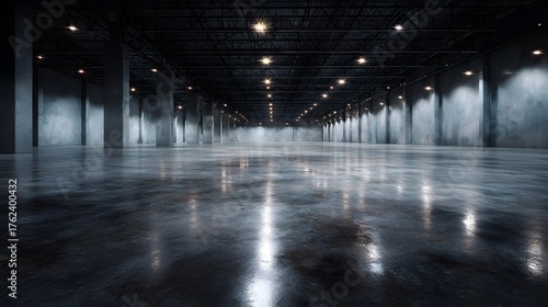Vast empty industrial warehouse interior with polished concrete floors and overhead lighting