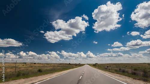 Vast empty road in summer with sunburst in bright blue sky overhead; Northern region, Iceland