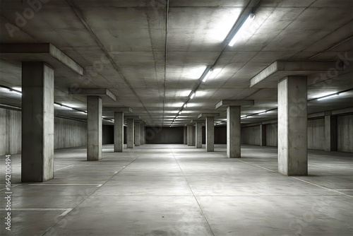 Vast, empty underground parking garage with stark concrete pillars and fluorescent lighting. A perfect urban industrial background for cars, architecture or suspense concepts.