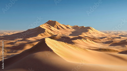 Vast golden sand dunes in the Sahara desert, an epic and remote landscape for travel and adventure, a beautiful background of solitude, light and shadow during the golden hour.