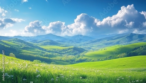 Vast green undulating grassland under a blue sky with white clouds, distant mountains, and scattered trees.