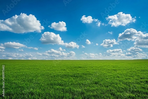 Vast green wheat field under bright blue sky with fluffy white clouds symbolizing agriculture growth freshness nature and peaceful rural landscape beauty