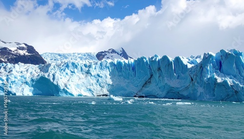 Vast icy glacier front with towe blue ice formations calving into dark ocean waters under cloudy sky in polar environment