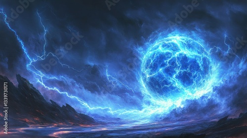 Vast landscape, stormy sky, celestial sphere. Fierce energy sphere