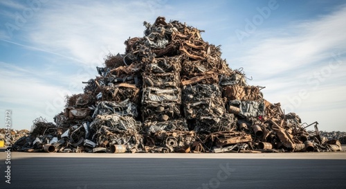 Vast pile of scrap metal under a blue sky, representing recycle and waste management. Industrial junkyard for environmental sustainability.