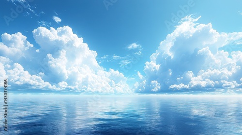 Vast, serene ocean meets a vibrant blue sky filled with fluffy white clouds
