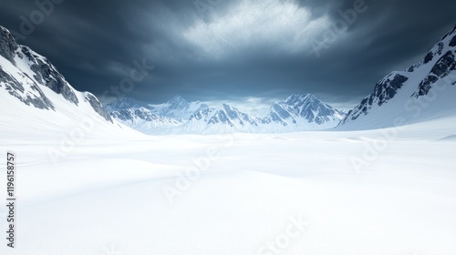 Vast snowy landscape with dramatic mountains under a moody sky.