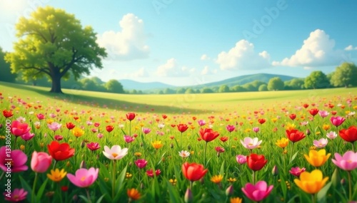 Vast spring meadow, vibrant blooms in panoramic view, gorgeous, meadow, serene