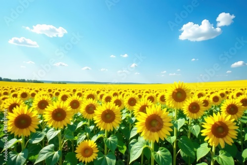 Vast sunflower field, vibrant yellow against a clear blue sky , photography, warmth