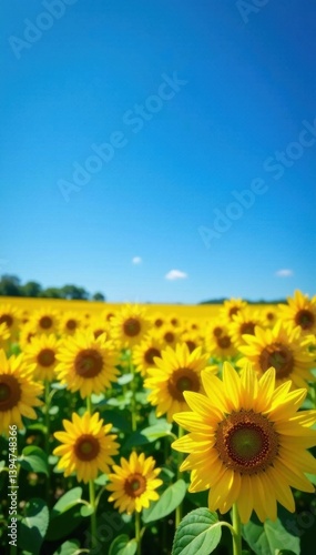 Vast sunflower field, vibrant yellow blooms under a clear blue sky , bright, botany