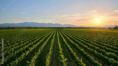 Vast Vineyard at Sunset, Rows of Vines Under Golden Light