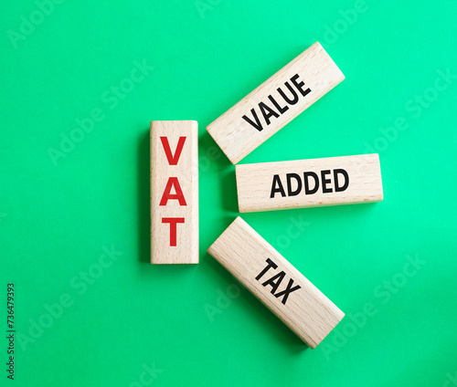 VAT - Value Added Tax symbol. Wooden cubes with word VAT. Beautiful green background. Business and Value Added Tax concept. Copy space.