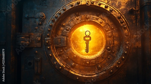 Vault door encrusted with discount markings golden key inserted halo of light forming