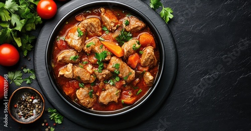 Veal Stewed with Vegetables in Tomato Sauce. AI generated illustration.