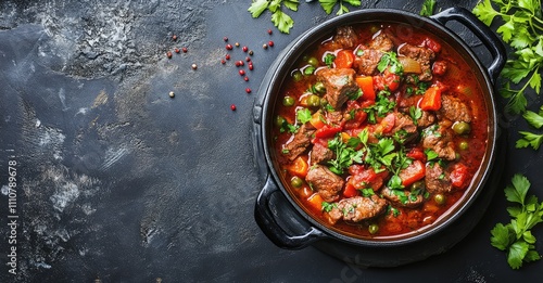 Veal Stewed with Vegetables in Tomato Sauce. AI generated illustration.
